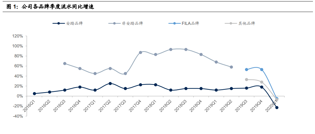 2020年4月15日,安踏体育发布了公告,其中2020年第一季度运营情况得到市场的关注。 2020年第一季度,公告指安踏品牌/FILA 品牌/其他品牌的销售流水分别录得负20%-25%/负中单位数/负高单位数的同比增长。