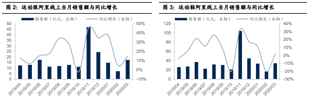 根据第三方平台获取的淘宝天猫数据,可以看到运动服/运动鞋板块一季度销售额分别同比增长20.2%/-0.4%,在疫情之下仍有较好的表现。