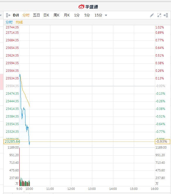 道琼斯工业指数开盘上扬,然而在10分钟内,该指数下滑。