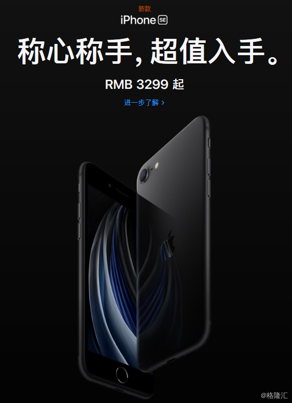 在苹果官网上,该新款iPhone的广告语为称心称手,超值入手。前面半部分可以忽略,关键是后半部分“超值入手”——新款iPhone SE的售价低至3299元。这个售价已低于很多安卓旗舰机型。