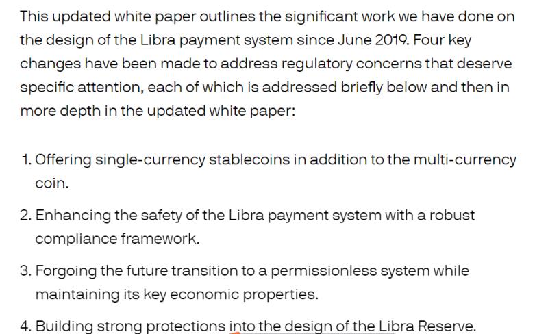 继中国央行法定数字货币DC/EP近期传出内测进展后,市场化数字货币的代表Libra也有了新的进展。凤凰网财经记者注意到,与2019年6月份的第一版Libra白皮书相比,这次设计的重要改变表现在四个方面:
