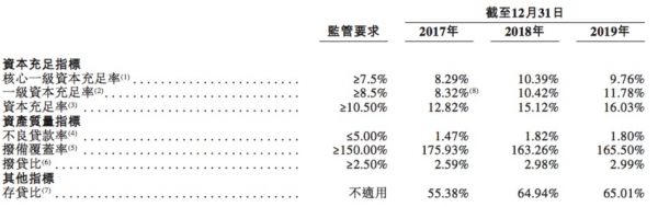 上市申请文件显示,威海银行2019年资本充足率16.03%,较2018年的15.12%略有提高;核心一级资本充足率为9.76%,均较2018年的10.39%略有下降,均高于监管指标要求。