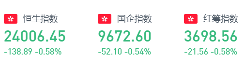 恒指周四盘中一度跌穿二万四关口,全天呈窄幅震荡走势。截至收盘,恒生指数跌138.89点或0.58%,报24006.45点,全日成交额达1058.43亿。国企指数跌0.54%,报9672.6点,红筹指数跌0.58%,报3698.56点。