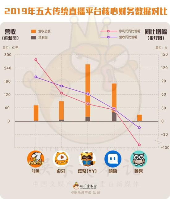 近期,五大传统直播平台陆续发了2019年年报。从年报数据中,可以明显看到,各家平台的总营收增速,以及直播营收增速开始放缓,甚至映客的两项指标都为负数。