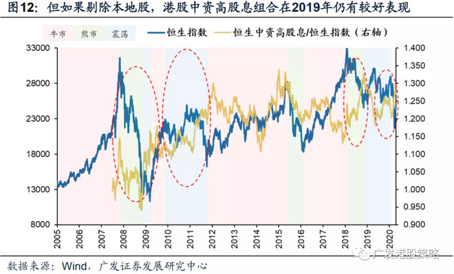 但为何19年以来港股高股息策略表现不及预期?我们认为,本地股或是最大的拖累。考虑到香港经济衰退趋势的延续,加上汇丰暂停派息事件的“余波”,预计我们仍要忍受香港本地高股息个股的相对疲弱。但如果剔除掉其中的本地股之后,恒生中资高股息指数的表现要更好,仅在2020年初-2月中旬期间明显弱于大盘,主要原因在于香港社会事件预期好转,而国内疫情发酵初期压制中资股表现。