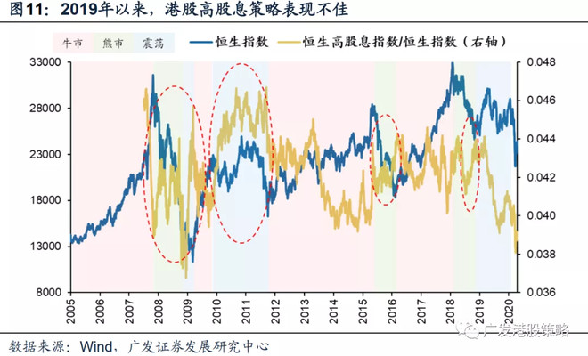 在大多数投资者的“惯性思维”中,高股息策略往往在股市震荡或下跌阶段表现较好,至少也能获得相对收益。从历史经验来看,多数时候港股高股息策略的确具备弱市周期中的相对防御和“降波动”效果。如果用恒生高股息指数进行复盘,港股震荡和熊市周期中的高股息组合往往能跑赢市场,如10年-11Q3、15Q2-16Q2、18Q3-Q4。相信投资者不难理解背后的逻辑,股票派息的“落袋为安”效应、低波动公司的“抱团防御”都是高股息策略在弱市中倍受青睐的理由。