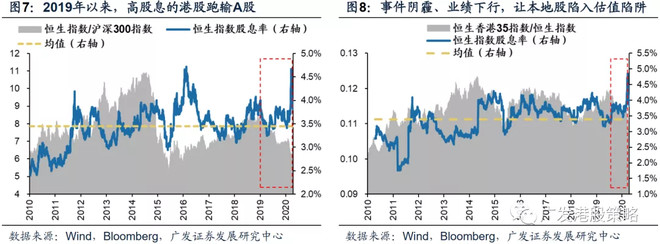 其一,冲着高股息买入港股的AH投资者忍受着更多的内心煎熬。跨AH市场配置的资金,如沪港深/港股通基金的持股反差最为显著,19年以来恒指的股息率多数时间超过历史均值3.4%,但高股息的港股既没有在跌势中降低波动(如20年3月),也没有在涨势中体现弹性(19Q1/20年1月);