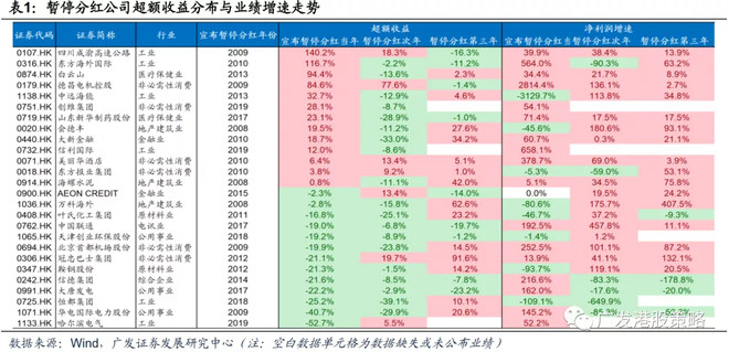 以上合理的猜想可以通过实证的数据进行简要的回溯。我们首先对港股公司中具有稳定分红历史,但出现过暂停分红情况的案例进行筛选,具体方法如下:1)近20年中分红次数总计在15次及以上;2)曾出现过暂停分红的年份,且在此之前已经稳定分红多年。