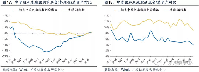 美中不足的是中资股净负债和净现金头寸的优势并不明显。恒生国企指数剔除腾讯后的净负债压力小幅提升(有息负债-现金/总资产),现金/总资产从19H1的4.9%下降至4%,其表现并未好于恒生香港35指数。