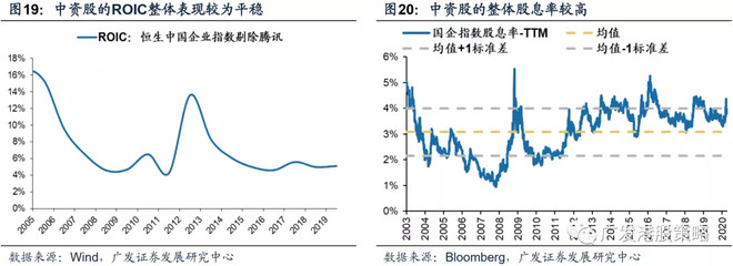 但预计偿债能力和现金创造能力的不足,并不会制约中资股的股息回报,基于以下两个原因:其一,不考虑杠杆的中资股ROIC走势平稳,即使考虑经济下行背景下的经营去杠杆,预计对盈利能力的拖累相对温和;其二,从股息率来看,即使不排除个别公司减少分红或暂停分红拉低平均现金回报,但中资股业绩韧性更强、债务和现金周期对新冠疫情相对“免疫”(参考报告《相比美股,港股基本面的双重“免疫力”》,2020-4-6),使得中资股的高股息率优势更加真实可靠,且在抵御外部风险方面较香港本地股更加从容,因而产生“价值陷阱”的概率更低。