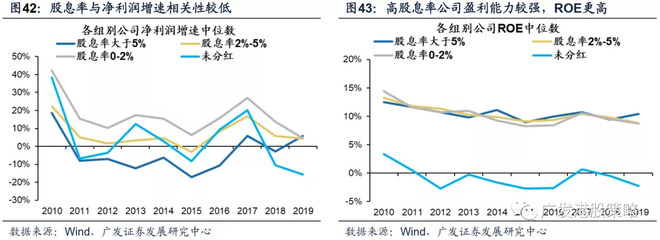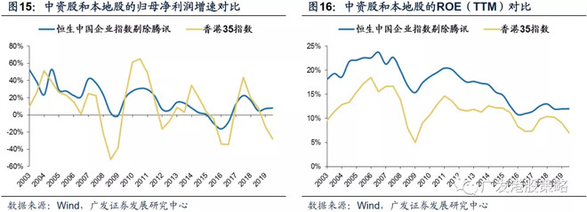 最核心的支撑因素来自于中资股业绩的相对韧性。从已公布的港股可比公司2019年财报来看,香港35指数(本地股样本)盈利增长已进入加速下行期,而恒生国企指数剔除腾讯(中资股样本)的归母净利润增速和ROE(TTM)无疑表现要得更具韧性。根据我们之前的讨论,前一年盈利恶化是导致稳定分红的公司做出暂停派息决策的重要原因,而中资股相比本地股的业绩下滑压力明显更小,减少分红或者暂停分红的动力也更低。