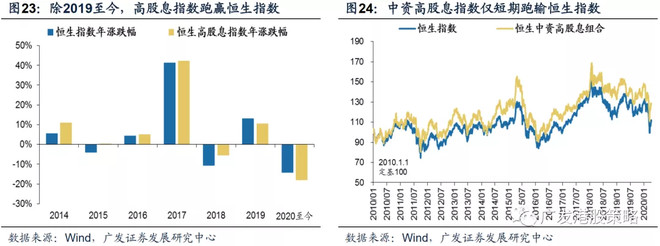 第一,港股高股息策略具备相对收益。以恒生高股息指数为例,除了19年以来,港股高股息策略中长期大部分时间内跑赢整体市场;如果用恒生中资高股息指数来代替,19年和20年至今的高股息策略具备相对收益,仅短暂时间内跑输恒生指数。