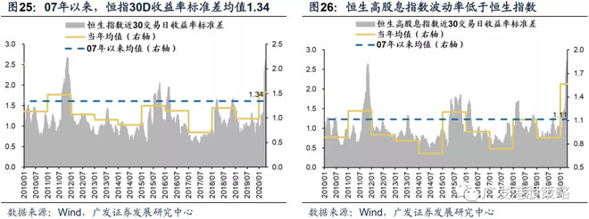 第二,港股高股息策略收益波动整体更低。若以30天收益率标准差衡量波动率,港股高股息策略波动率更低(07年以来均值1.11,低于恒指的1.34),因而风险调整收益高。