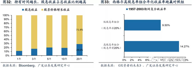 海外经验表明,稳定的股息收益对长期投资回报贡献较大。根据MSCI统计,投资期限越长,股息收益占持有收益的比例越高,当投资期限达20年时,全部收益的接近30%来自股息。