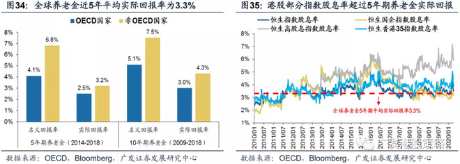 第一,对于投资港股的海外资金而言,需要参考一个相对稳定的收益率“锚”,以决定何时才是逆向投资的最佳时点。我们参考的是全球养老金(OECD和非OECD国家)长期实际回报率作为逆向布局的价值“锚”,目前恒生高股息指数的股息率高于5年期和10年期实际回报率的3.3%和4.1%,恒指股息率介于5年期和10年期平均实际回报率之间,港股高股息公司对于海外养老金已具备长期配置价值。