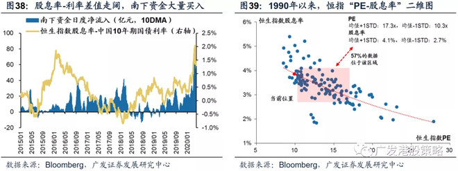 第二,对于“北水南下”的国内资金而言,除了利率下行这一宏观驱动因素外,还需要在“股息率-PE”、“股息率-债券收益率”等二元关系中找到适合投资的“舒适区”。