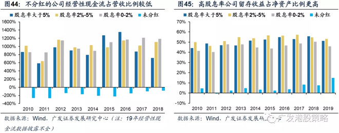 第二,财务因子重ROE、现金流、留存收益:(1)成长性并不具决定性,但稳定性很重要;(2)高股息率和ROE通常存在线性关系,高盈利能力是分红派息的基础;(3)现金流是衡量未来分红潜力的重要指标,不分红的公司通常是经营性现金流占比较低的公司;(4)港股高股息公司通常账面上留存收益较大,派息比例更高。