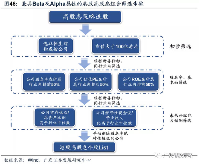 基于市值、估值、财务状况等多维度因素,我们可以构建具备一定Alpha属性的港股高股息组合,具体步骤如下:以恒生综指成份股为基准,首先剔除低市值与分红不连续公司,再选取同行业中高股息率、低估值、高ROE标的,而后进一步筛选出留存收益占比高、经营性现金流占比较高的公司,最后剔除组合中因行业因素导致绝对股息率较低的标的。