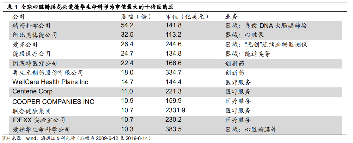 美股过去十年(2009-6-12 至 2019-6-14)共诞生 12 支市值 100 亿美元以上的十倍医药股,其中全球心脏瓣膜龙头爱德华生命科学(EW.N)实现了 10 年 10 倍涨幅,市值高达 384 亿美元(2019-6-14)。