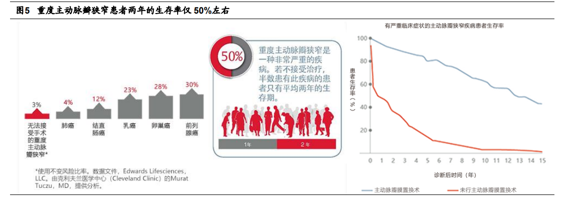 如果瓣膜这扇门无法正常开关,就会影响血液正常流动,通常瓣膜会出现两种问题,一种是狭窄,指瓣膜不能完全打开,这会导致通过瓣膜的血流量不足;另一种叫瓣膜关闭不全或反流,血液会反流到原先供血的腔室,导致通过这扇门的有效血流量减少,心脏经常做无用功,进而影响全身的血流量。主动脉瓣狭窄是逐渐发展的,一旦病人出现症状,比如活动量下降、气喘等,如果没有得到治疗,就将会出现更严重的症状,比如晕厥、心绞痛,甚至猝死。根据瓣膜120 官网数据,一旦发展为重度主动脉瓣狭窄,2 年的生存率仅为 50%左右,5 年生存率仅为 20%。严重的主动脉瓣膜狭窄比很多疾病,甚至转移性的癌症的预后更差。