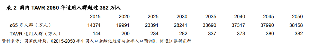 经导管心脏瓣膜是心血管领域下一片蓝海市场。根据国家统计局及《2015-2050 年中国人口老龄化趋势与老年人口预测》,2050 年我国 65 岁及以上人群达 3.82 亿人,按照 1%的适用率,估计国内 TAVR 适用人群382 万人。
