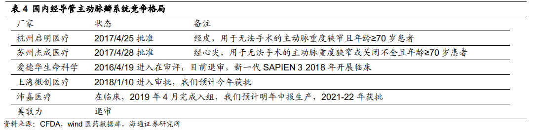 目前国产的杭州启明医疗的介入人工心脏瓣膜系统 VenusA-Valve 和苏州杰成医疗的介入人工生物心脏瓣膜 J-Valve 已经通过创新器械特别审批在 2017 年获批上市,爱德华生命科学的 SAPIEN 退审,2018 年初刚开展最新一代经导管主动脉瓣膜系统 Sapien 3的临床试验,微创的 VitaFlow 正在审批中,美敦力已经退审,沛嘉的经导管主动脉瓣膜系统 TaurusOne 正在临床。