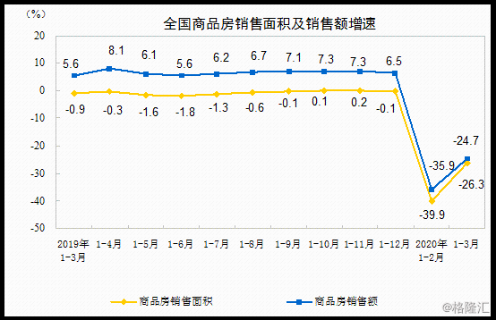 一季度,房地产开发投资下降7.7%,全国商品房销售面积21978万平方米,下降26.3%;商品房销售额20365亿元,下降24.7%,其中,住宅销售额下降22.8%,办公楼销售额下降36.8%,商业营业用房销售额下降39.8%。