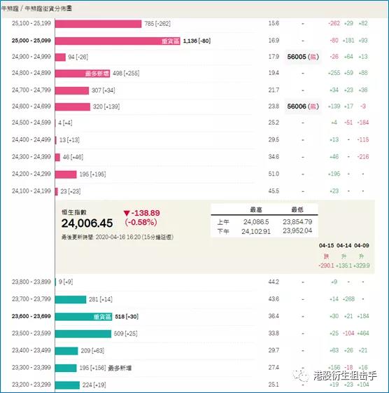 周四恒生指数低开近120点,其后盘中守30日线于24000点附近窄幅震荡。截至收盘,恒生指数跌138.89点或0.58%,报24006.45点,全日成交额达1058.43亿。即月期指收报23948点,下跌104点,低水58.45点。当日认股证成交额减少至68.74亿港元,占大市比例约6.49 %,牛熊证成交额约96.17亿港元,占大市比率约9.09%。