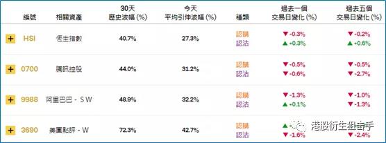 周四恒指波幅指数(VHSI)收报30.07,上涨0.57%。个股权证方面,个股的相关认购证涨跌不一,中芯国际、下调2.6%,认沽证方面,舜宇光学、建设银行分别上调7.1%、6.9%。