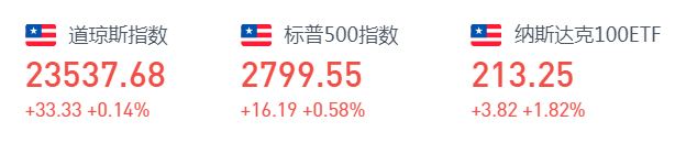 周四收盘,标普500指数涨16.2点,涨幅0.58%,报2799.55点;纳指涨139.2点,涨幅1.66%,报8532.36点;道指涨33.3点,涨幅0.14%,报23537.68点。
