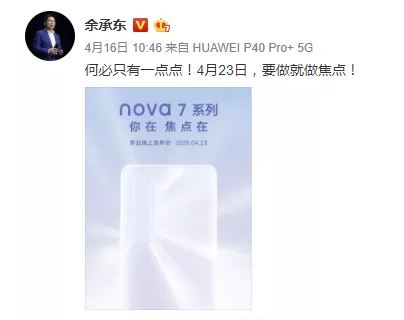 对此,余承东发微博直接叫板“何必只有一点点!4月23日,要做就做焦点”,4月23日也就是P40系列之后华为下一款手机Nova7系列的发布日。