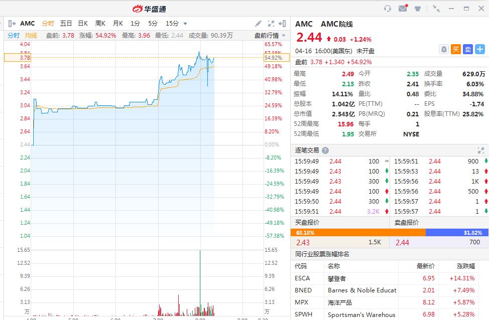 AMC院线(AMC.US)盘前涨超50%,AMC通过发行5亿美元债券来提高流动性。