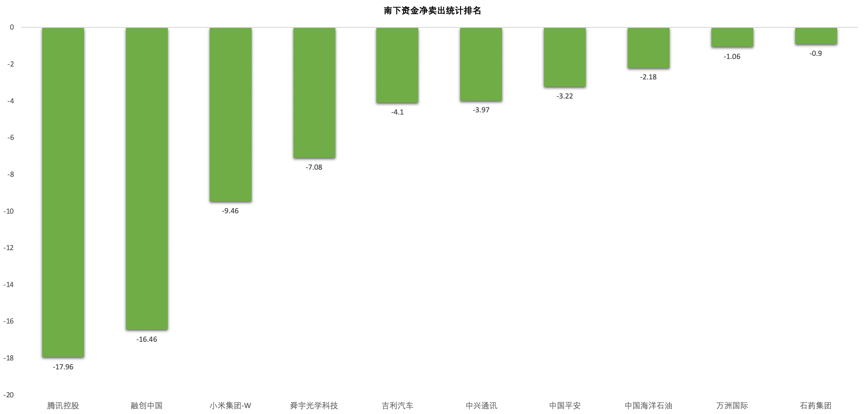 南下资金净卖出标的中,腾讯控股遭净卖出17.96亿港元,位列净卖出排名第一;融创中国遭净卖出16.46亿港元,位列净卖出排名第二。此外,小米集团-W、舜宇光学科技均遭大额卖出,一周累计净卖出额分别为9.46、7.08港元。