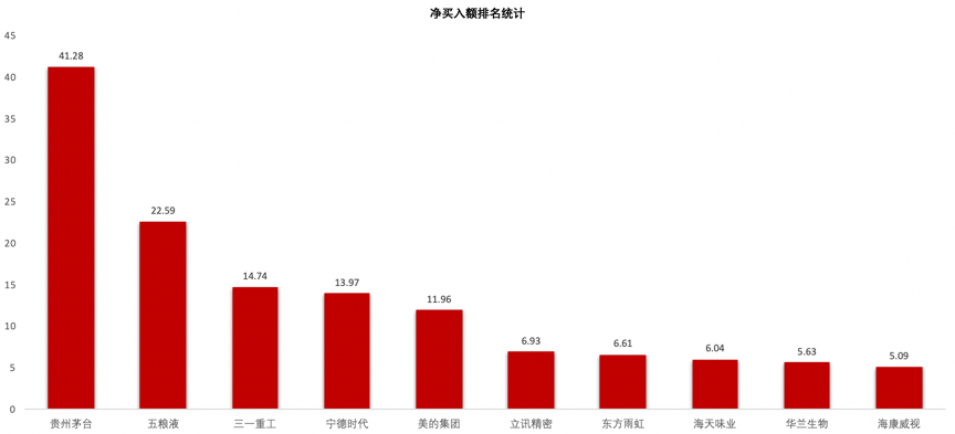 北向资金净买入标的中,贵州茅台获资金买入最高,获净买入41.28亿元;五粮液位列第二,获净买入22.59亿元;三一重工、宁德时代、美的集团等标的均获超10亿净买入。