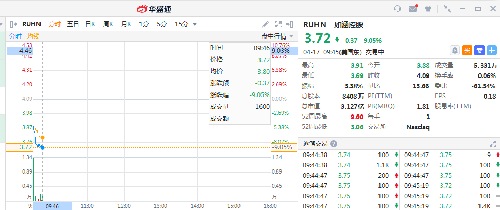 新浪科技讯 4月17日晚间消息,截止发稿,今日美股开盘,网红张大奕背后的如涵控股股价跌9.05%,最新股价为3.72美元/股。