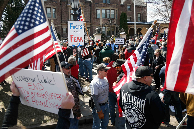 这三个州的州长都是民主党人,此举立即引发美国舆论的热议。纽约时报称,特朗普的推文是在怂恿示威者。本周早些时候,由保守派团体组织的上千名抗议者驾车在密歇根州州议会大厦前示威,反对居家限制,还有一些示威者挥舞着支持特朗普的横幅,抗议州长格里芬·惠特默(Gretchen Whitmer),高喊“把她(惠特默)铐起来”。