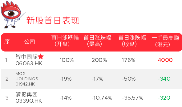 周五亚洲速运的暗盘表现也相当不错,尾盘收涨48%,一手赚1200港元。另外两只新股表现不佳,满贯集团首日跌36%,MOG HOLDINGS更直接腰斩跌了45.6%。可谓冰火两重天!