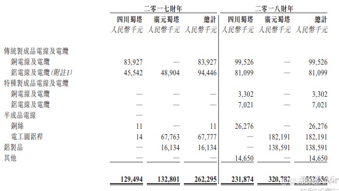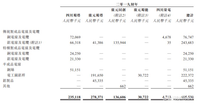 就收益而言,电线及电缆为该公司的主要产品,而其电线电缆导线主要由铜和铝制成。于2017年、2018年及2019年,电线及电缆之收益总额销售占比分别为93.8%、72.4%及 93.3%。