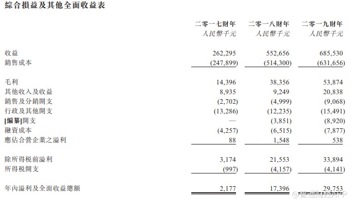 于2017年、2018年及2019年,该公司分别录得溢利人民币2.2百万元、17.4百万元及29.8百万元,相应录得纯利率分别为0.8%、3.1%及4.3%。