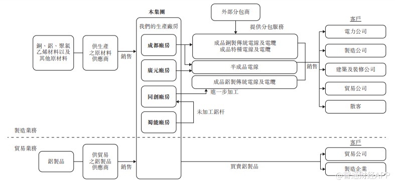 公司主要从制造及销售制成品电线及电缆或半成品电线,买卖铝制品及销售电缆配套设备(较少程度上)产生收益。于往绩记录期间,公司主要销售自有品牌的制成品电线及电缆,有要求时也按OEM基準生产及销售铝电缆。以下为公司业务模式简化流程图:
