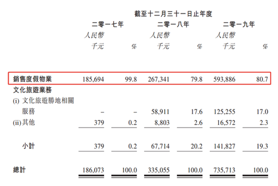 2017年至2019年期间,中国文旅分别收入1.86亿元、3.35亿元、7.36亿元,其中销售度假物业的营收比例较大,期内占比为99.8%、79.8%、80.7%。