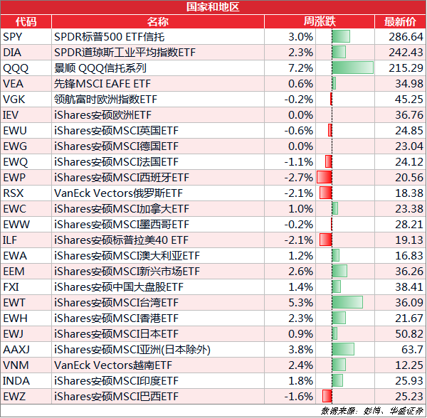 美股科技板块的亮丽表现,使得纳斯达克100指数在上周“牛冠全球”,QQQ以7.2%的周涨幅傲视群雄,MSCI台湾指数其次。