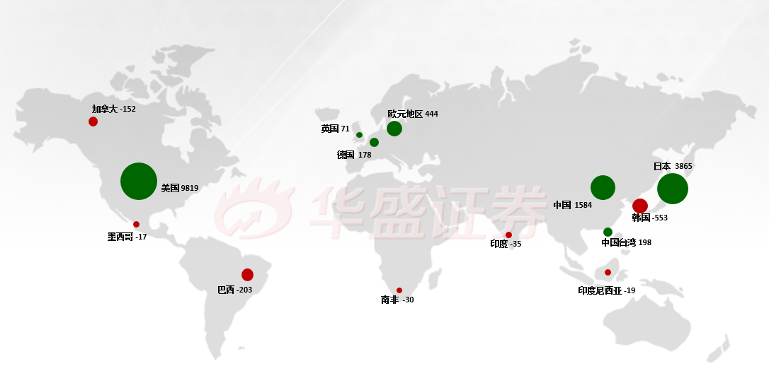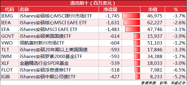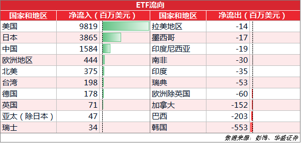 中国市场恢复了“老三”的席位,净流入近16亿美元,是前一周的11倍多。而韩国、巴西和加拿大领先资金流出榜,分别净流出5.5亿、2亿、1.5亿美元。