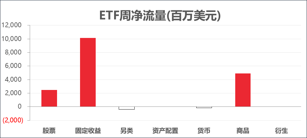 上周股票类ETF资金流入放缓,债券和商品的流入则大幅上升,尤其是债券,净流入资金飙升,超过100亿美元。