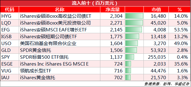 债券类ETF上周独占鳌头,而高收益公司债又是其中最受追捧的细分,在流入前十排行榜中,占据了前2名。其中LQD已连续4周上榜,规模再扩14%。
