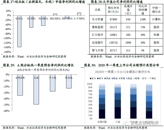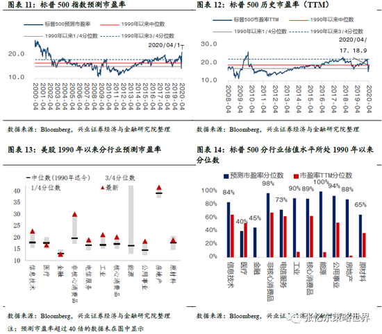首先,随着财报季启动,美国上市公司盈利预测面临新一轮的猛烈调整是大概率事件。她周报里面说,截至4月17日,根据Bloomberg统计的标普500指数2020年一致预期EPS增速已经下降为-11.3%。1)美国经济衰退概率大幅提升,彭博经济研究的美国衰退概率模型显示,美国经济将在未来12个月步入衰退的概率从2月份的33%升至3月的100%。2)实际披露的Q1财报弱于预期。截至美东时间4月16日,标普500指数成分股中已披露一季度的40家公司相较于2019Q1净利润同比下降32.66%。分行业来看,除非日常生活消费品业(同比增长6.13%)和医疗保健(同比增长4.26%)外,其余行业净利润均有所下降,其中金融业盈利下滑最为严重,相较于2019Q1,2020Q1金融业净利润同比下降53.01%,严重逊于预期。