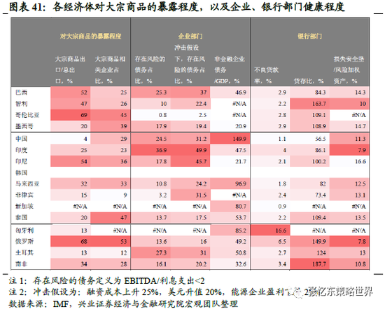 其次,疫情冲击下,大宗商品价格受需求的压制而大幅调整,巴西、智利等大宗商品出口国均面临较大压力。由于拉美私人部门外部融资中外债占比较高,且对大宗商品依赖较高,整体经济前景压力可能较大。而从对大宗商品的具体暴露程度来看巴西、智利、哥伦比亚、俄罗斯、印尼均面临较大压力。