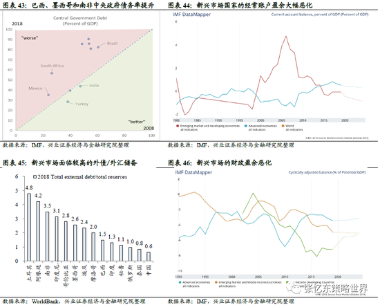 政府债务率提升。以巴西、墨西哥和南非为例, IMF 2018年最新数据显示,巴西、墨西哥和南非政府债务/gdp分别为82.5%、35.4%和56.7%,而这一数值在08年分别为60.7%、24.0%和26.5%。
