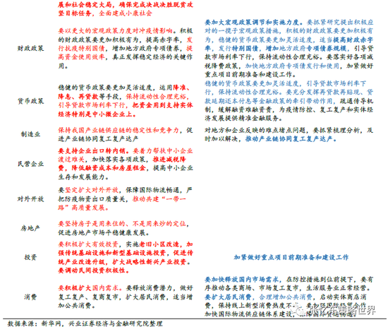 1)经济目标完成的节奏措辞有所调整。3月27日的表示为,“确保实现决胜全面建成小康社会、决战脱贫攻坚目标任务。”到4月17日的“确保完成决战决胜脱贫攻坚目标任务,全面建成小康社会”可以看出,经济建设目标更加强调稳中求进。