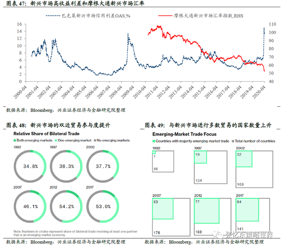 根据彭博的统计,在2007年,有新兴市场参与的所有的双边贸易中占比为46.1%,而在2017年该数值提升至53.0%。截至2017年,与新兴市场进行多数贸易的国家数量也从2007年的53个增加到64个。